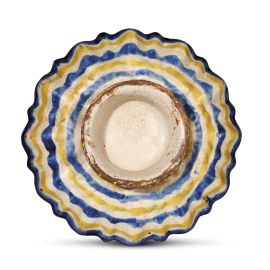 in maiolica dipinta a policromia con verde, blu di cobalto, giallo antimonio, giallo arancio, verde ramina, bruno di manganese. La coppa ha un umbone centrale rilevato, tesa baccellata a conchiglia e orlo sagomato. La decorazione sulla tesa mostra un ornato a quartieri con settori di forma romboidale accostati tra loro intorno all’umbone centrale su due file concentriche, ed entro le riserve sono dipinti foglie stilizzate e delfini su fondo arancio, verde e blu. Al centro un ritratto virile barbato con elmo e clamide annodata sulla spalla sinistra su fondo giallo, accompagnato da un cartiglio con il nome Camilo delineato in caratteri capitali. Sul retro un motivo a calza nei colori blu e giallo arancio disposti a linee parallele. Numerosi sono i confronti pertinenti, ma su tutti segnaliamo la coppa del Museo Medievale di Arezzo, a suo tempo pubblicata da Gaetano Ballardini, nella quale il personaggio al centro, Annibale, mostra particolare vicinanza al nostro ritratto, e la coppa per forma e disposizione dei quartieri è molto prossima, distinguendosi soltanto per la scelta differente dei decori e dei colori di fondo degli stessi; diam. cm 23,5, diam. piede cm 11, alt. cm 7