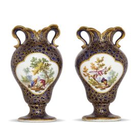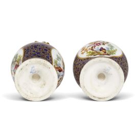 in porcellana dipinta in policromia e oro. La forma ad anfora con anse fitoformi, denominate à oreilles, trova riscontro nella produzione a pasta tenera della metà del secolo, come per esempio i due vasetti del Louvre con decoro con scene di putti (inv. n. OA11986). Il decoro presente sulla superficie dei vasi, denominato “bleu lapis caillouté”, fu eseguito in manifattura dopo il 1755, e trae la denominazione caillouté (ciottolato) per l’effetto visivo: esso circonda due coppie di riserve lobate decorate con motivo ad uccelli, probabilmente dipinte da Felix Levé, attivo in manifattura negli anni settanta. Marca della manifattura con lettere g all’interno e f sulla destra in blu; alt. cm 12,6, diam. piede cm 5,2