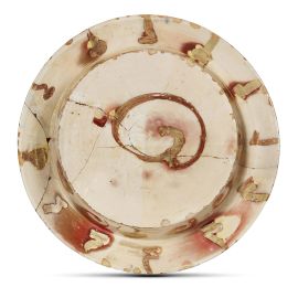 in maiolica decorata a lustro metallico, oro e blu, ispirato ai bacili cinquecenteschi della “serie dell’Ave Maria”. Il bacile ha larga tesa piana e un profondo cavetto con parete verticale, centrato dalla raffigurazione di un volatile delineato in blu tra sottili tralci vegetali; sulla tesa invece è presente l’iscrizione abbreviata in quattro parti: ave – ma – ple -na intervallata da decori circolari. Anche il retro è interamente smaltato e decorato da motivi spiraliformi in oro; diam. cm 37,4, alt. cm 6,8