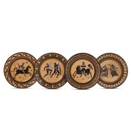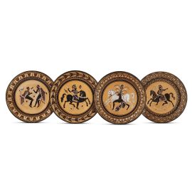 in terracotta naturale, dipinti a figure nere su fondo rosso alla cosiddetta maniera “greco-sicula”, tipico esempio della produzione Giustiniani in “creta naturale”; sulla tesa decori secondari di vario stile e al centro figure classiche. Tre piatti recano al retro la marca incussa IN con la giara, i rimanenti, appena più sottili, una lettera G corsiva; diam. cm 24