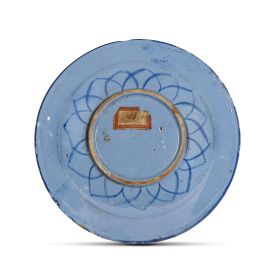 in maiolica dipinta in monocromia azzurra, cavetto profondo e larga tesa piana con bordo leggermente rilevato. Il decoro, che si sviluppa uniformemente su tutto il fronte, mostra un paesaggio con due gruppi di edifici intervallati al centro da una roccia verticale affiancata da un albero sinuoso. Sul retro l’anello del piede è circondato dal tipico decoro a canestro. Sul fondo vecchia etichetta di collezione; diam. cm 25,2, diam. piede cm 11,6, alt. cm 3,2