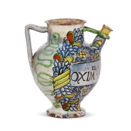 in maiolica dipinta in policromia, corpo di forma globulare con alto collo cilindrico e stretto piede svasato, beccuccio tubolare collegato nella parte superiore da cordicella e ansa a nastro. L’ornato si concentra nella parte anteriore, con una ghirlanda fogliata di tipo robbiano con piccoli frutti e nastri che proseguono con svolazzi sul retro, al cui interno si trova il cartiglio con l’iscrizione a caratteri capitali nella fascia centrale; nella parte inferiore un emblema farmaceutico con lettere IFC sormontate da croce, mentre un cherubino alato è dipinto nella zona del cannello; alt. cm 23, diam. bocca cm 10,3, diam. piede cm 9,5
