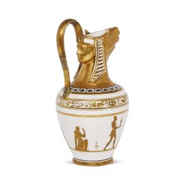 in porcellana dipinta in policromia e oro, corpo piriforme su basso piede dotato di versatoio a testa bifronte, caprina sul fronte e a forma di testa egizia sul retro, dalla quale si diparte un’ansa a sezione piana di forma incurvata. Il decoro ripropone in oro motivi egizi e piccole figure all’antica su fondo bianco. In Manifattura lo stile egiziano era stato sviluppato per il centrotavola modellato sull'Antico e realizzato per la Duchessa di Parma nel 1790, testimoniato anche dagli imponenti orologi con motivi egizi conservati nel Museo di Capodimonte; alt. cm 20, diam. piede cm 5,5