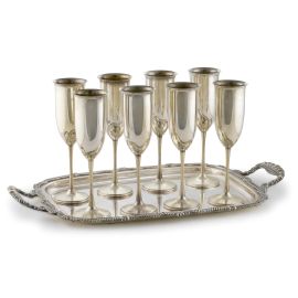 VASSOIO BIANSATO, VASSOIO CIRCOLARE E SEI BICCHIERI A CALICE, SECOLO XX