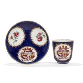 in porcellana dipinta in policroma e oro, decorata con rose e stemma nobiliare entro riserve risparmiate in bianco su fondo blu. Tale decoro costituisce la variante più sofisticata delle roselline di impronta francese ricordate negli inventari di fabbrica, qui dipinte con grande accuratezza e poste su fondo blu ispirato al bleu lapis di Sèvres. Importante notare che uno dei tre medaglioni, sia nelle tazzine che nei piattini, è qui riempito con lo stemma della famiglia genovese Brignole Sale, probabilmente realizzate in occasione di un matrimonio. Tazza con corpo a campana su piede ad anello con presa a doppio rametto intrecciato; tazzina alt. cm 7, piattino diam. 13,2