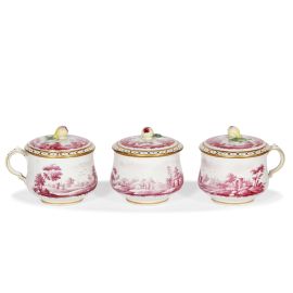 in porcellana dipinta in policromia e oro, la superficie interamente decoro a monocromia porpora con paesaggi alberati. Coperchi sormontati da presa a forma di frutto policromo e bordati con il tipico decoro definito “a mezzo uovo”; alt. cm 7,5 (compreso il coperchio)