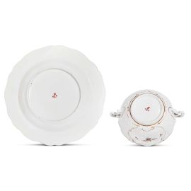 in porcellana dipinta in policromia e oro, decorata con fiorellini sparsi distribuiti su tutta la superficie. La tazza ha forma emisferica con due prese rocaille, il corpo interamente lavorato a treillage ad eccezione di due ampie riserve sagomate e bordate in oro, che ospitano altrettante composizioni floreali; uguale decorazione si ripete sul coperchio, sormontato da una grossa presa modellata a tulipano dipinto in viola. Anche il piatto mostra la lavorazione a treillage sulla tesa, interrotta in questo caso da tre riserve sagomate. Un esemplare analogo è presente nelle raccolte del museo V&A di Londra (CIRC.85-1929), proveniente probabilmente dallo stesso servizio. Marca ancora in rosso sul fondo di entrambe i pezzi; tazza diam. cm 13,5, piatto diam. cm 21,7