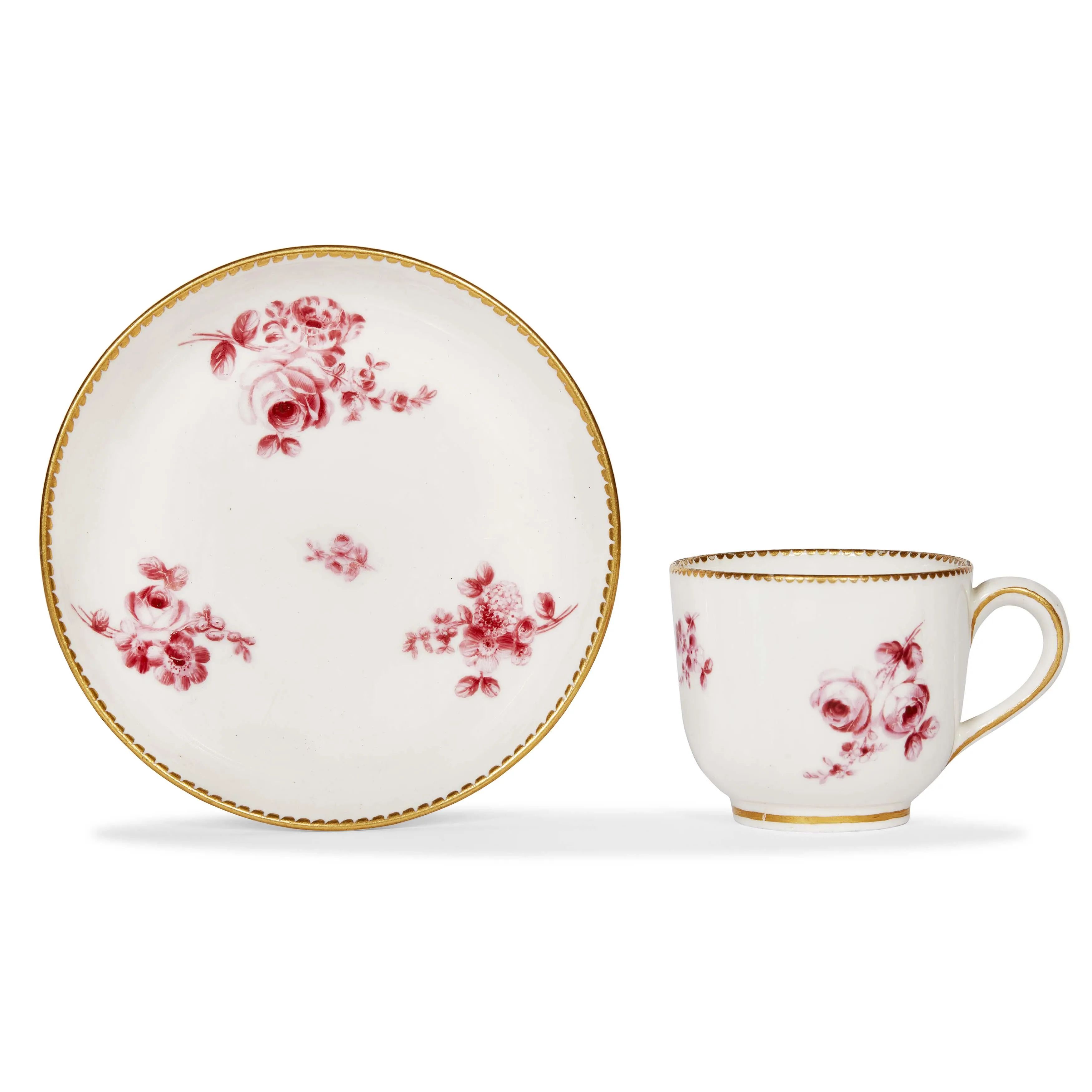 in porcellana dipinta in monocromia porpora e oro. Il decoro, distribuito simmetricamente sulla superficie, vede mazzetti di roselline intervallati da mazzetti più piccoli sia sulla tazza sia sul piattino, mentre gli orli, l’ansa e il piede della tazza sono interessati da linee in oro o da decoro a piccole dentellature. La marca sul retro indica chiaramente il 1768 come data di produzione 1768, proponendoci quindi un raro esempio della prima produzione ancora in porcellana tenera della Manufacture Royal. La tazza a campana e il piattino rotondo poggiano su piede ad anello. Marca con lettera P all’interno e lettere G.T. in blu su entrambi i pezzi; etichetta di provenienza S. Giusti / U. Podestà – Milano sul retro del piattino; tazzina alt. cm 6, piattino diam. cm 12,8