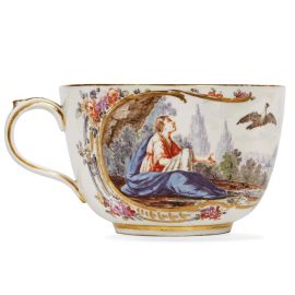 in porcellana in policroma, probabilmente ad opera di Cajetan Purtscher, con scene ispirate alle Metamorfosi di Ovidio. Sia la raffigurazione dipinta sulla tazza che quella sul piattino sono contornate da una cornice asimmetrica, aperta sulla destra, delineata in oro e arricchita sa mazzi di fiori policromi. Anche l’interno della tazzina mostra una composizione floreale. Marca della manifattura incussa nella pasta di entrambi i pezzi ed etichetta di provenienza Silvia Giusti Antichità – Milano sul retro del piattino; tazzina alt. cm 5, piattino diam. cm 13,7
