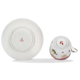 in porcellana dipinta in policromia e oro, decorata nel caratteristico motivo definito negli inventari di fabbrica come a squama porpora, derivato dalla tipologia ornamentale della porcellana cinese Qianlong, introdotta in Europa da Meissen tra il 1750 e il 1760; tale ornato è qui accompagnato da composizioni di frutta su fondo bianco racchiuse da bordure di maglie embricate color porpora delineate in oro e arricchite da fregi anch’essi dorati. Tazza a campana su base ad anello con manico a voluta sagomata. Marca in rosso sul fondo di entrambi i pezzi; tazzina alt. cm 5,9, piattino diam. cm 12,8