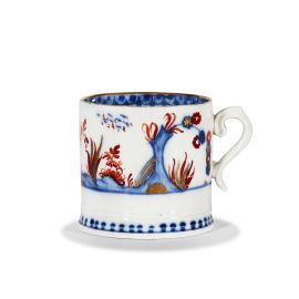 in porcellana dipinta in policromia e oro secondo la tavolozza Imari. Il decoro prevede una cornice ad archetti all’interno dell’orlo, che ritorna in maniera più semplificata nella parete esterna in prossimità della base, mentre la fascia mostra un decoro con peonie, fiori di pesco e tralci fioriti. Tazza di forma cilindrica con base leggermente estroflessa e presa a ricciolo. Sul fondo marca asterisco in rosso ed etichetta di provenienza S. Giusti/U. Podestà – Milano; alt. cm 5,5