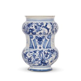 in maiolica monocroma, forma a rocchetto con ventre fortemente rastremato e spalla e base arrotondate, piede a disco, collo basso e cilindrico con orlo appena estroflesso. Il decoro a fasce con motivo “calligrafico naturalistico” mostra cervi e animali in un paesaggio, con vasto repertorio vegetale di derivazione orientale, e al centro cartiglio con scritta farmaceutica in caratteri corsivi delineata in blu. Il vaso trova riscontro in alcuni albarelli coerenti del Museo di Genova. Marca lanterna sul fondo; alt. cm 19,8, diam. bocca cm 11,2, diam. piede cm 8,7