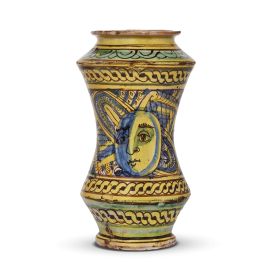 in maiolica dipinta in policromia, corpo di forma allungata e rastremata al centro con spalla e calice angolati. Sul fronte, entro un medaglione racchiuso in una cornice baccellata, è delineato un profilo virile su fondo giallo, delimitato sopra e sotto da una cornice a nastro continuo, mentre la restante superficie è occupata da un motivo continuo a trofei; alt. cm 25,5, diam. bocca cm 10,5, diam. piede cm 9,4