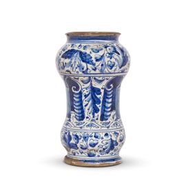 in maiolica monocroma, forma a rocchetto con corpo cilindrico rastremato al centro e spalla espansa e calice arrotondato, base piana e collo breve e dritto. L’albarello è decorato su fondo smaltato bianco crema e mostra sulla fascia centrale un cartiglio con l'iscrizione farmaceutica in caratteri capitali delineati in blu. Attorno al cartiglio una sequenza di foglie e grandi boccioli vegetali dal profilo sagomato. Sotto il cartiglio un emblema con scudo con tre fioretti su fondo blu. L’albarello per stile e resa pittorica ci pare già vicino a esiti decorativi ripetitivi, databile probabilmente alla fine del secolo XVII; alt. cm 20,5, diam. bocca cm 8,8, diam. piede cm 9