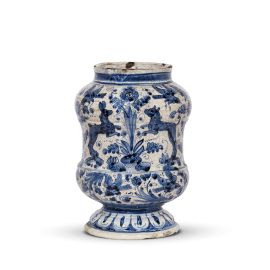 in maiolica monocroma, corpo a rocchetto poco rastremato al centro, poggiante su alto piede convesso con strozzatura cilindrica, e collo basso e cilindrico. Il decoro in blu su bianco con rami, fiori, animali vari è dipinto in stile calligrafico. Per qualità e aspetto formale l’opera trova riscontro in prodotti coerenti della manifattura Mordioni di Urbania; alt. cm 18,4, diam. bocca cm 8,4, diam. piede cm 10,3