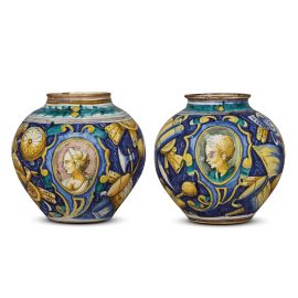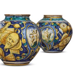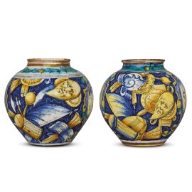in maiolica dipinta in policromia, corpo globulare con orlo “gittato” poggiante su base piana. L’intera superficie è dipinta su un rivestimento a smalto spesso e brillante, con un ornato insolito, dove il corpo interamente ricoperto da panoplie e trofei su fondo blu circonda da un lato due medaglioni con cornice a cartoccio, in cui sono raffigurati un ritratto maschile su fondo verde e uno femminile su fondo manganese, e dall’altro un’altra coppia di medaglioni che racchiudono un putto che sorregge un fascio e un erotino con arco; a completare l’ornato una ghirlanda robbiana a foglie lanceolate e piccoli frutti dipinta sulla spalla. I due vasi, transitati sul mercato in una celebre asta tenutasi a Milano nel 1986, non hanno confronti puntuali precisi, ma ritrovano qualche affinità in un vaso globulare del MIC di Faenza nella donazione Mereghi, con un curioso gioco di foglie su fondo giallo e alcune panoplie, oppure in un vaso della collezione Cini di Venezia, che riporta una decorazione a trofei con strumenti musicali. Decori affini si trovano anche in due albarelli già appartenuti alla collezione Cora, dove ritorna il ritratto muliebre in campo giallo. Tuttavia il gusto dei trofei, di chiara derivazione marchigiana, trova maggior vicinanza nei lavori della bottega di Mastro Ludovico, lasciando aperta la strada a nuovi approfondimenti. Sul fondo etichetta MOSTRA MAIOLICA ITALIANA / LA MIA CASA 1977; alt. cm 21,4, diam. bocca cm 10,7, diam. piede cm 10,4