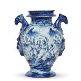 in maiolica dipinta in monocromia, corpo ovoidale con bocca e piede estroflessi, anse a testa di grifone innestate al di sopra dei mascheroni satireschi a rilievo, mentre al centro in basso è posto un terzo mascherone a gola forata per l’inserimento di una spina metallica a rubinetto per prelevate il preparato apotecario; l’imboccatura presenta un anello cilindrico che doveva sorreggere un coperchio o consentire la copertura del vaso. Il decoro in monocromia blu di cobalto è del tipo “istoriato barocco” con gioco di putti in un paesaggio con casolari, interrotto sopra il mascherone dal cartiglio con scritta farmaceutica in lettere corsive. La forma è quella tipica dei grandi vasi farmaceutici liguri, atti a contenere liquidi e preparati fluidi, che tanto successo ebbero nel Seicento e nel secolo successivo, periodo nel quale ci pare di ravvisare una vicinanza stilistica con le produzioni della fornace Veneziano; alt. cm 36, diam. bocca cm 15,2, diam. piede cm 16,8