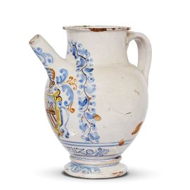 in maiolica dipinta in policromia, corpo ovoidale con alto collo cilindrico e bocca larga con orlo estroflesso, piede basso che si allarga su base larga dal profilo arrotondato, manico a nastro dal profilo spesso contrapposto al cannello cilindrico. L’ornato occupa la parte anteriore con un emblema entro cornice rocaille sormontato da cimiero e raffigurante un volatile arso rivolto verso il sole, emblema iscritto in una cornice a foglie blu cobalto delineate con rapidità; lungo la base corre invece il cartiglio farmaceutico. La forma e il decoro avvicinano il versatoio in oggetto alla produzione castellana tra la seconda metà del XVII secolo e l’inizio del secolo successivo, con modalità pittoriche veloci e già standardizzate rispetto alla prima produzione dei “bianchi” castellani; alt. cm 20,5, diam. bocca cm 9,5, diam. piede cm 8,7