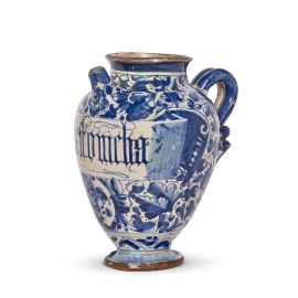 in maiolica monocroma, corpo di forma ovoidale su piede piano espanso, collo cilindrico con orlo appena aggettante, ansa a doppia corda desinente a ricciolo, cannello breve e cilindrico. Il decoro, realizzato su fondo smaltato bianco crema, prevede una sequenza di tralci sinuosi e foglie bipartite che si sviluppano su collo e piede, a incorniciare sul fronte il cartiglio dalla terminazione mossa e ombreggiata con iscrizione farmaceutica in caratteri gotici delineati in blu, sotteso da mascherone femminile; sul retro, sotto l’ansa, è dipinto un vaso baccellato. Il vaso trova riscontro morfologico e stilistico in un’opera analoga conservata nella collezione Bayer di Milano; alt. cm 21,5, diam. bocca cm 8,5, diam. piede cm 7,8