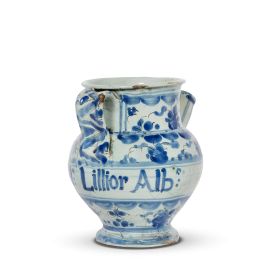 in maiolica monocroma, corpo ovoidale su basso piede, collo cilindrico e ansa a nastro. Il decoro “a fasce” è eseguito seguendo il motivo “a tappezzeria”, intorno al cartiglio con scritta farmaceutica in caratteri corsivi delineata in blu; alt. cm 17,5, diam. bocca cm 11,5, diam. piede cm 9,2