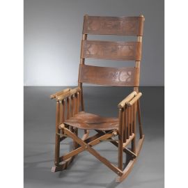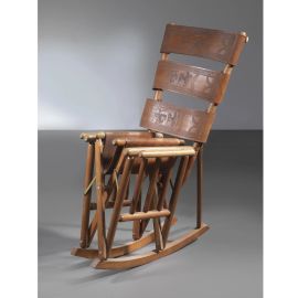 THREE ROCKING FOLDING CHAIRS, WOODEN STRUCTURE, BROWN LEATHER SEAT