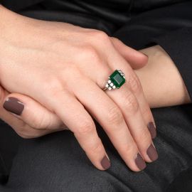 in oro bianco 18kt, impreziosito al centro da uno smeraldo taglio ottagonale di ct 4.80 circa, affiancato da diamanti taglio brillante per ct 0.50 circa, mis. 20/60, gr. 5
