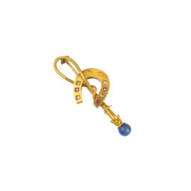 realizzato a forma di stella, in oro giallo 18kt, mis. 13/53, gr. 7; accompagnato da una spilla a barretta in oro 14kt, raffigurante al centro un ferro di cavallo, impreziosito da rubini taglio rotondo e rose di diamante, con una sfera in lapislazzuli, dim. cm 2x5 circa, gr. 6