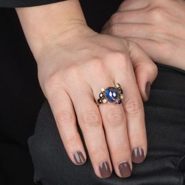 in oro giallo 18kt, impreziosito al centro da uno zaffiro taglio cabochon di ct 9 circa, circondato da zaffiri taglio ovale e rotondo per ct 1.60 circa, diamanti taglio brillante e vecchio per ct 0.40 circa, mis. 21/61, gr. 11