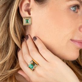 in oro giallo e bianco 18kt, composta da un anello a fascia di mis. 22/62, e da paio di orecchini romboidali a clip di cm 2x2 circa, impreziosita da smeraldi taglio ottagonale per ct 3.70 circa, gr. 29 complessivi