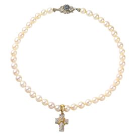 di cui una ad un filo di perle di mm 7 circa, fermatura e ciondolo a forma di croce in oro giallo e bianco 18kt, impreziosita da diamanti taglio brillante per ct 0.30 circa e zaffiri taglio rotondo, punzone 750, lungh. cm 40; accompagnata da una seconda collana ad un filo di perle leggermente digradanti di mm 16-11 circa, fermatura in oro 14kt impreziosita da diamanti taglio huit huit, punzoni 14kt e 585, lungh. cm 50, gr. 151 complessivi
