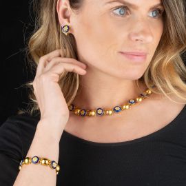 in oro giallo 18kt, composta da una collana lunga cm 45, un bracciale lungh. cm 17,5 e paio di orecchini a clip di diam. cm 1,5 circa, realizzata a catena con una serie di semisfere alternate a dischi in lapislazzuli sormontati da fiori, punzone 750, gr. 93 complessivi
