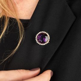 in oro 14kt, al centro un'ametista sfaccettata di ct 17 circa, circondata da una fila di perle di mm 2 circa, punzone 14kt, dim. cm 2x2, gr. 8
