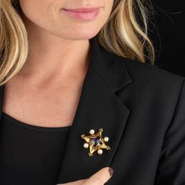 in oro a basso titolo, spilla a forma di stella stilizzata con perle di mm 6 circa, dim. cm 4x4; accompagnata da un pendente a forma di cuore di cm 2,5x3, gr. 17 complessivi