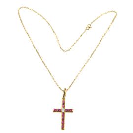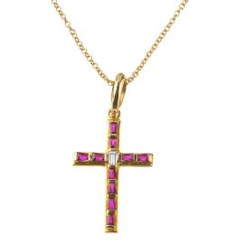 in oro giallo 18kt, impreziosita da perle di mm 3 circa e rubini taglio rotondo per ct 0.20 circa, punzone 750, dim. cm 3x3; accompagnata da una collana con pendente a croce impreziosito da un diamante taglio baguette e rubini taglio tapes per ct 0.90 circa, punzone 750, lungh. cm 40, dim. pendente cm 2x4, gr. 14 complessivi