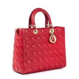 In pelle di agnello morbidissima di un bel rosso lacca, con il caratteristico matellassé cannage e il ciondolo a forma di lettere che compongono il logo DIOR; doppio manico e tracolla staccabile. Chiusura superiore con zip in ottone color oro lucido come tutta la metalleria, piedini inclusi. Scomparto unico con fodera in tela e taschina con zip.
