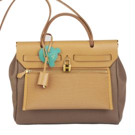 Una perfetta borsa per l'utilizzo quotidiano in tela Hunter color taupe e patta superiore in vacchetta come il manico e la tracolla.Ha una tasca posteriore esterna chiusa con zip e un pouch interno. Accessori in ottone dorato con logo Hermes per un lusso soft.