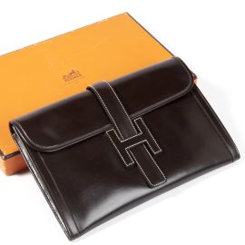 Raffinata pochette in pelle di un caldo color cioccolato con cuciture a contrasto sulla H frontale che funge anche da chiusura. Interno in lino beige.