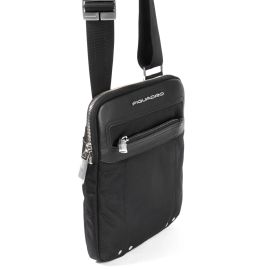 In tela nera con tracolla regolabile in nastro con logo, uno scomparto centrale e una tasca piccola frontale chiuse da zip; interno con fodera verde chiaro, organizzato con tasche multiuso e portachiavi.