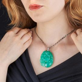 in oro bianco 18kt, da cui pende un ciondolo in calcedonio intagliato di dim. cm 4x6 circa, impreziosito da diamanti taglio brillante per ct 0.30 circa, lungh. cm 43,5, gr. 47