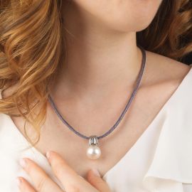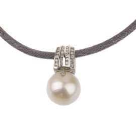 cordoncino in gomma, da cui pende un ciondolo in oro bianco 18kt impreziosito da una perla south sea di mm 15 circa e diamanti taglio brillante per ct 0.50 circa, lungh. cm 40, dim. pendente cm 1,5x2,5, fermatura in oro bianco 18kt, gr. 16