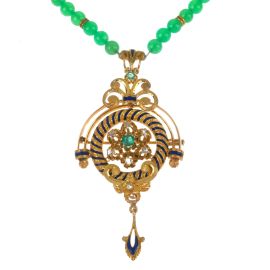 ad un filo di sfere in calcedonio, con fermatura e spilla/pendente in oro giallo 18kt, decorata in smalto blu e impreziosita da due smeraldi taglio rotondo e rose di diamante, punzone 750, lugh. cm 40, dim. pendente cm 3,5x6,5, gr. 39 complessivi