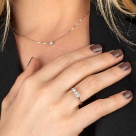 in oro bianco 18kt, collana con diamante pendente taglio brillante di ct 0.10 circa, lungh. cm 42, anello trilogy con tre diamanti taglio brillante per ct 0.45 circa, mis. 14/54, gr. 5 complessivi
