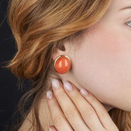in oro giallo 18kt, di cui un paio impreziosito da due grandi perle mabé di mm 20x12 circa, chiusura a clip con perno, punzoni 750 e del fabbricante, diam. cm 2 circa; accompagnati da un secondo paio di orecchini con coralli di mm 19x24 circa, chiusura a clip con perno, punzoni 750 e del fabbricante, gr. 44 complessivi