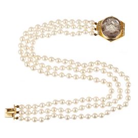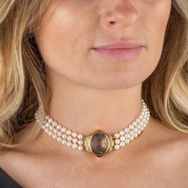 realizzata a tre fili di perle di mm 5 circa, fermatura in oro giallo 18kt impreziosita da un quarzo sfaccettato raffigurate uno stemma inciso, e da diamanti taglio brillante per ct 0.20 circa, lungh. cm 33,5, gr. 59