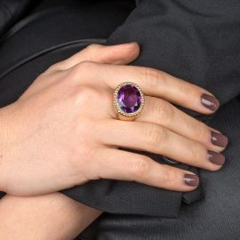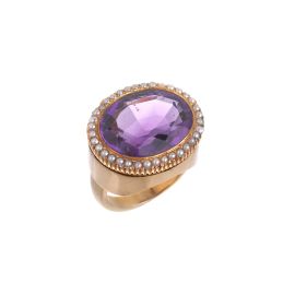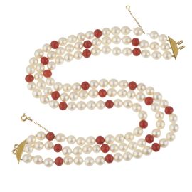 realizzato a tre fili di perle di mm 7 circa alternate a boules in corallo di mm 6 circa, fermatura in oro giallo 18kt, lungh. cm 33, gr. 76; accompagnato da un anello in oro giallo 18kt, impreziosito al centro da un'ametista taglio ovale di ct 11 circa circondata da una fila di microperle, mis. 15/55, gr. 15