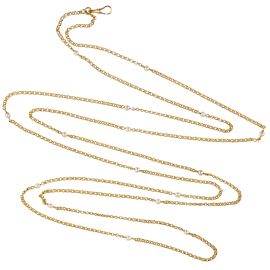 in oro giallo 18kt, realizzata a doppio filo, con perle di mm 4 circa, corredata di moschettone, lungh. cm 84, gr. 34; accompagnata da un elemento in corallo di dim. cm 5x3 circa, gr. 8