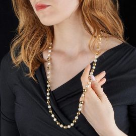 in oro giallo 18kt, realizzata ad un filo di perle di mm 7 circa alternate a sfere in oro giallo 18kt, punzone 750, lungh. cm 79, gr. 52