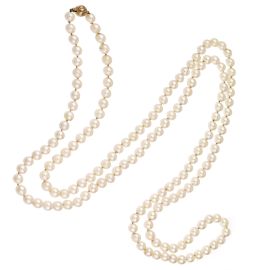 ad un filo di perle di mm 7 circa, fermatura in oro 14kt, punzone 14kt, lungh. cm 135, gr. 105; accompagnata da un orecchino in oro bianco 18kt, con perla mabé (difetti) di mm 16x11 circa sormontata da diamanti taglio brillante e huit huit (uno mancante) per ct 0.30 circa, chiusura a clip, dim. cm 1,5x2 circa, gr. 8