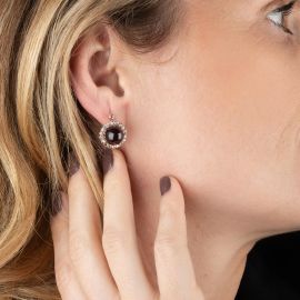 in oro 9kt, impreziositi al centro da due granati taglio cabochon per ct 10 circa, circondati da una fila di rose di diamante (una mancante), chiusura a monachella, dim. cm 1,5x1,5 circa, gr. 6 complessivi