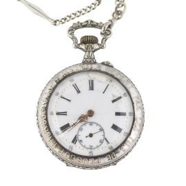 Un orologio Lion Peugeot dalla cassa in due parti in metallo, fondello finemente decorato con immagine di leone stante su freccia, bordo decorato con motivi floreali, quadrante bianco in porcellana (difetti), numeri romani e arabi, lancette Luigi XV, secondi a ore sei, movimento a carica manuale. Diam. mm 49. Corredato di catena in metallo con distanziali geometrici, lungh. cm 30